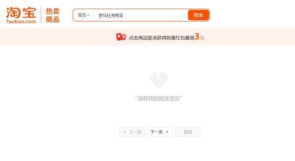 监管压力已经传导至市场渠道。《华夏时报》记者发现,不同电商平台对罗马仕产品的处置呈现两极分化。淘宝全面屏蔽了相关搜索结果,页面显示“没有找到相关宝贝”并配有一个破碎心形图标;而京东平台仍正常销售多款产品,但部分店铺出现名称错写、描述混乱的情况。